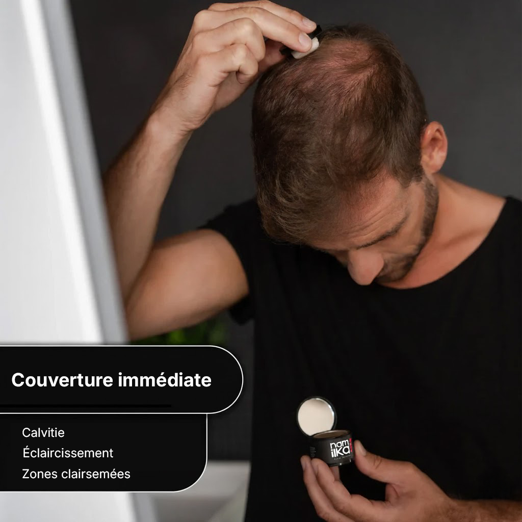 Même sur les zones qui paraissent chauves, il existe souvent de petits cheveux fins ou clairs. La poudre s’y fixe naturellement pour combler visuellement les manques et créer un effet de densité homogène et naturelle — même en cas de perte de cheveux avancée.
